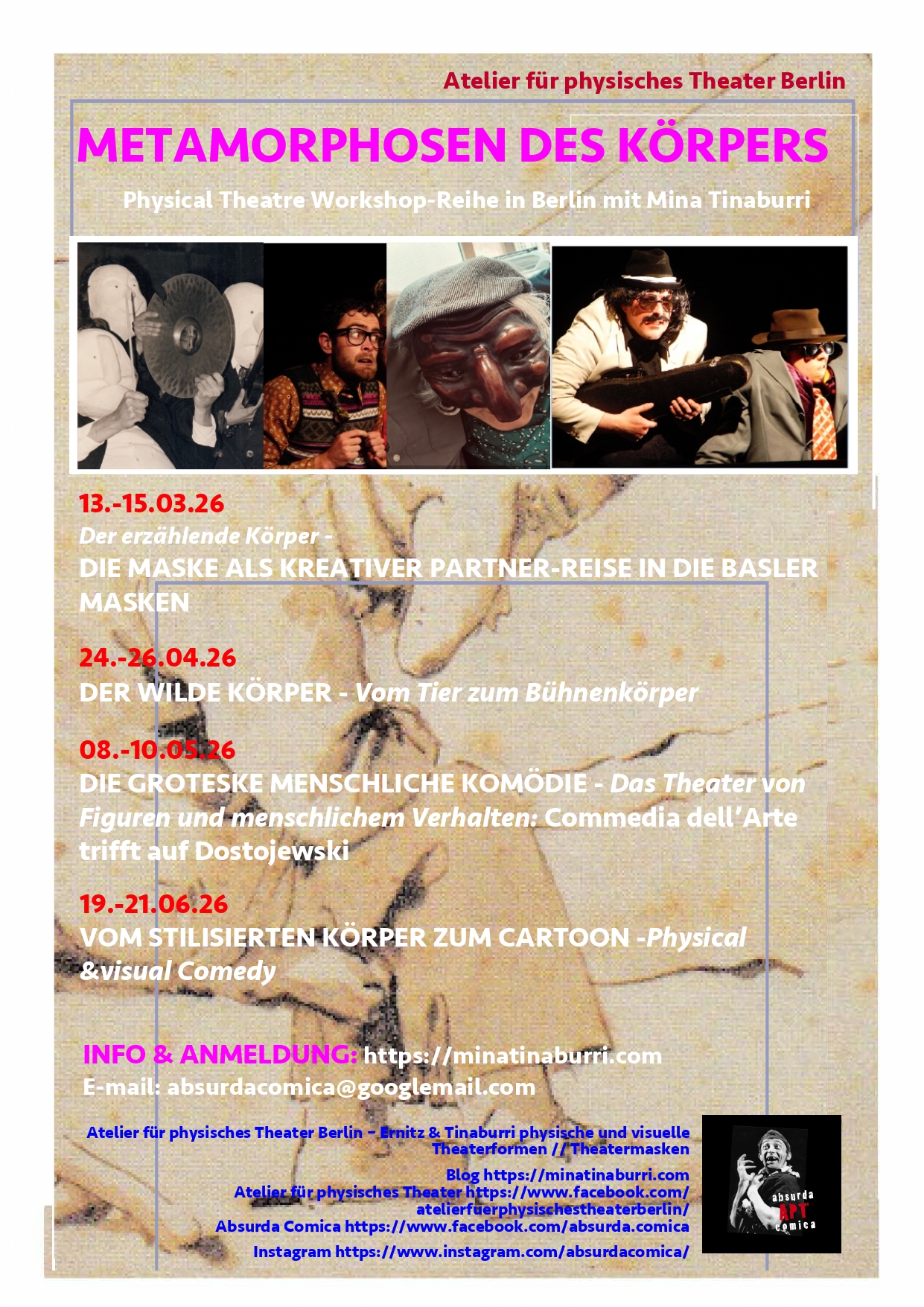 Zielgruppe: Für alle, die Lust haben, körperliche Komik, gestische Übertreibung und rhythmisches Spiel zu erforschen – Schauspieler:innen, Performer:innen, Theaterbegeisterte oder neugierige Entdecker:innen. Vorerfahrung ist nicht nötig; wichtig sind Bewegungsfreude, Humor und Offenheit für überzeichnete Figuren, Cartoons und expressive Gesten.